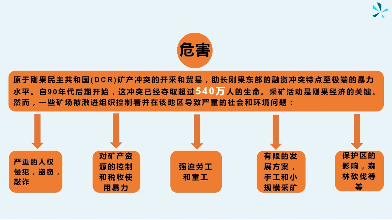 此类不符合“无冲突规范”的地区的矿物产品除刚果民主共和国(DRC)外,还包括卢旺达(Rwanda)、乌干达(Uganda)、布隆迪(Burundi)、坦桑尼亚(Tanzania)、肯尼亚(Kenya) 等联合国安全理事会认定的产自刚果矿脉之矿物。