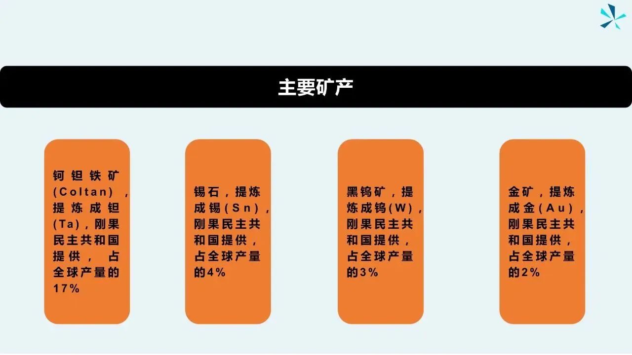 产自刚果矿区矿物有金(Au),钽(Ta),钨(W),和锡(Sn)等金属矿物